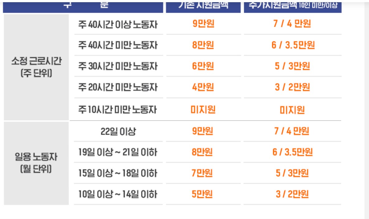 소정근로시간 기준으로 주 40시간 이상 노동자는 기존지원금액 9만원 = 추가지원금액은 10인이하 7만원, 10인이상 추가지원금액은 4만원정도 입니다.